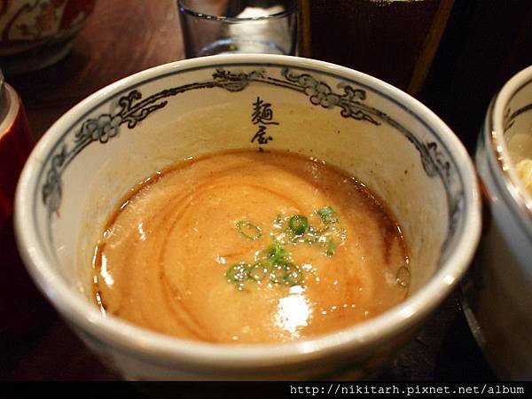 這是沾麵的湯,拉麵的湯頭可以選清淡或濃厚,為了要忠於原味,當然選濃厚囉看照片應該看的出來醬汁的濃厚,麵放進去後醬汁可以順利吸附在麵條上,好吃!一點也不會覺得太黏膩!不過店家主動幫我們把麵加大,再加上波妞身體不舒服一直鬧場,所以我們麵跟叉燒都沒吃完,店家還好心問我們要不要幫我們打包,貼心。