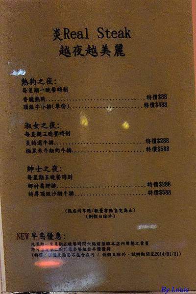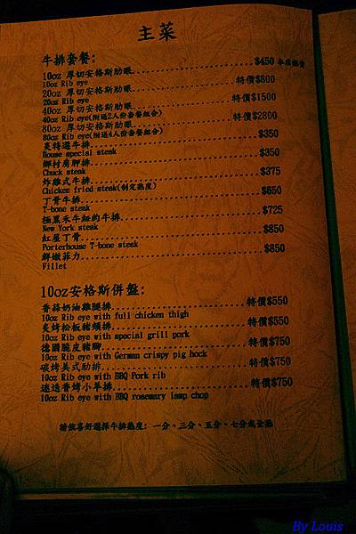 桃園中正藝文特區的店愈來愈多了,這天壞波妞不在,特地選一家不用考慮小鬼的店來吃!最近牛排店愈開愈多,不知是那裡起的濫觴…!必需先說明的是店裡太有情調了,所以拍出來的照片不調整一下很難看,所以全都是調整過的!
