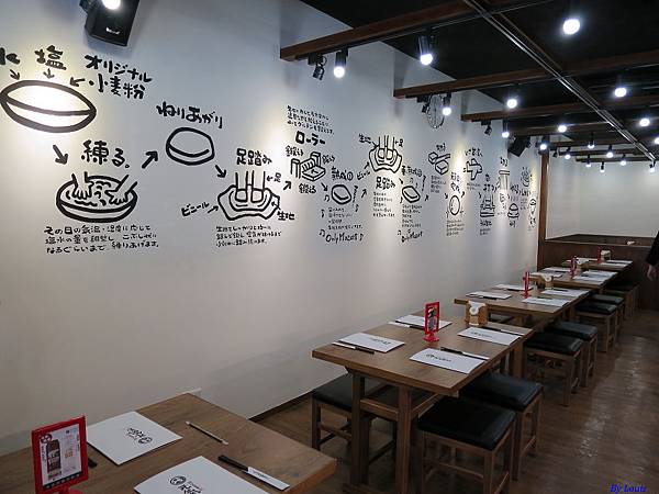 星期日的早上,台北似乎還沒醒,空盪盪的,店裡也沒有其他的客人;差點就怕踩雷不敢進來了。牆上的畫其實是店家烏龍麵的做法ㄛ,畫在牆上很有趣吧!