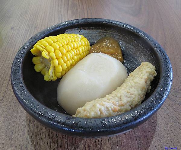 甜不辣,沾醬是味噌喔;品名上是「日本大根」,不曉得有沒有騙人,但真的還蠻好吃的;不過其實台灣的菜頭季節對了也很好吃。