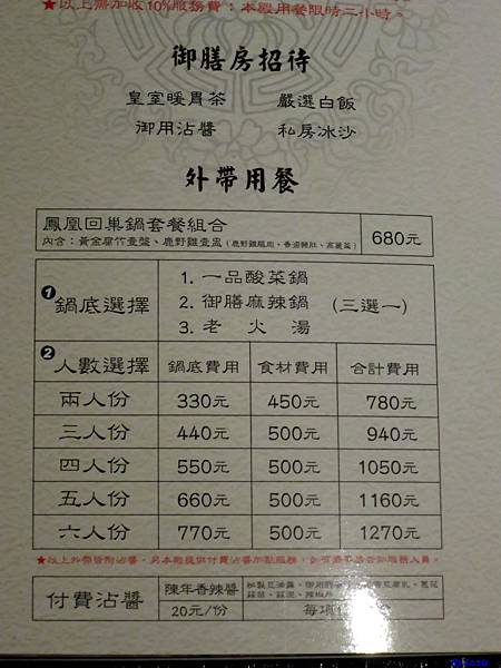 今天我們點了「御膳麻辣鍋」加「一品酸菜鍋」,這樣每人$110,每鍋再加上$150,就是鴛鴦鍋要再加$150啦,單種鍋就不用