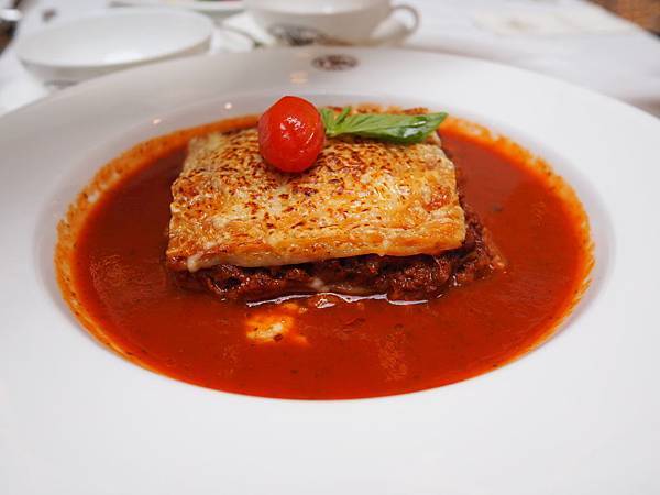 「TWG主櫥精選千層麵」$500,法式燉牛肉千層麵搭配經典自製燉蕃茄羅勒醬佐摩洛哥薄荷綠茶…(好長)! 好吃但份量不多