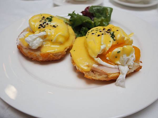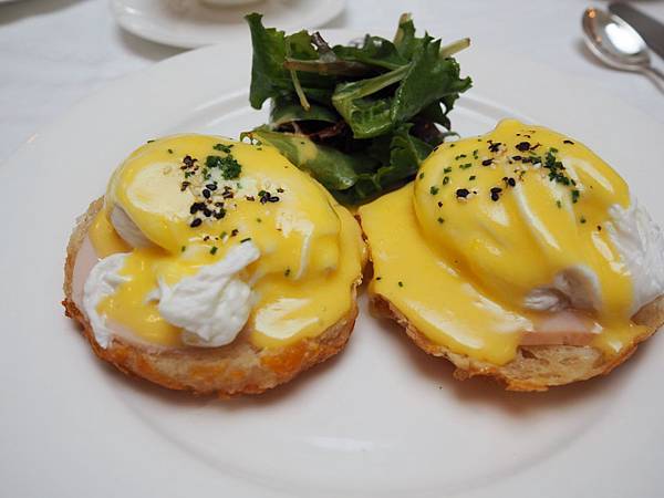 「班尼狄克蛋」$450,以自家烘焙英式馬芬為底,搭佐兩顆正統水波蛋與荷蘭醬! 我們吃的是火雞火腿,這個醬口感是酸的