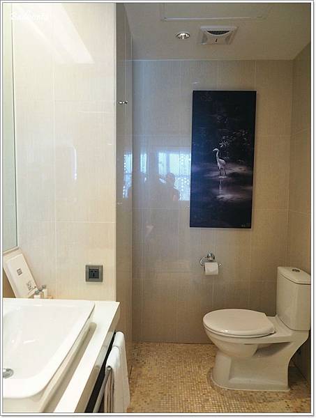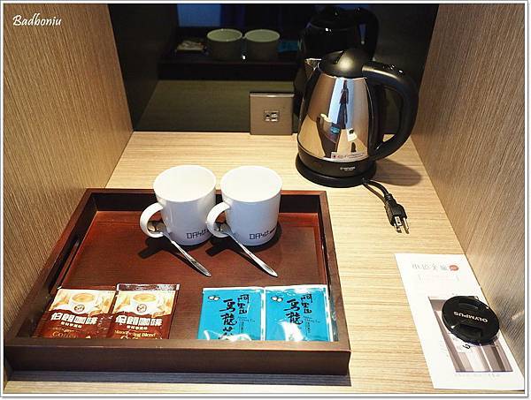 簡簡單單的MINI BAR,茶包是阿里山烏龍茶,咖啡包是伯朗咖啡。MINI BAR下就是鞋櫃,只是開放式的設計壞波妞就會一直把鞋子拿出來玩來玩去orz,所以如果有個門可能會好一點。冰箱是透明的,這樣離開時有沒有東西忘在冰箱裡就一目瞭然,而且冰箱很安靜,都沒聽到壓縮機的聲音。