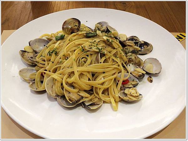 「白酒蛤蠣扁麵」 $230,喜歡的原因除了本來就愛吃細扁麵外,炒得較乾一點,不會濕膩膩的,蒜頭放得蠻多的,幾乎每口都吃得到蒜片,但因為炒熟了所以不會嗆,辣椒也是不會辣的那種,但整體上來說還是有剛剛好的刺激味。剛上來的時候覺得頗大一盤,吃完後覺得想再來一盤! 波妞拔吃到剩蛤蠣殼,連蒜片都吃光光。