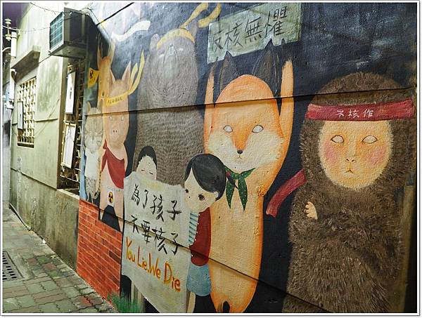 這條暗巷還有反核的彩繪呢! 估且不論我們對核能的看法,但就把它當成地標吧!