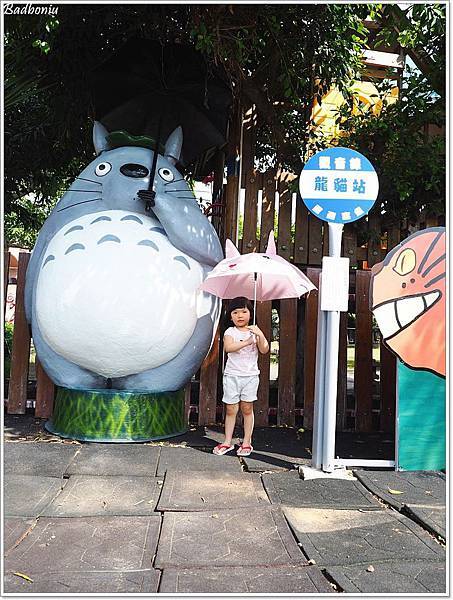 這個龍貓公車站就位在觀音新坡的和美幼兒園的圍牆外,不用進到幼兒園裡面就可以看到。波妞一下車看到大龍貓,笑得可開心的!