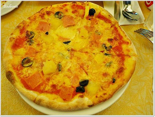 波妞媽最愛的夏威夷PIZAA,屬於薄皮口味,小的也不會太大,一家三口吃完還覺得6、7分飽。