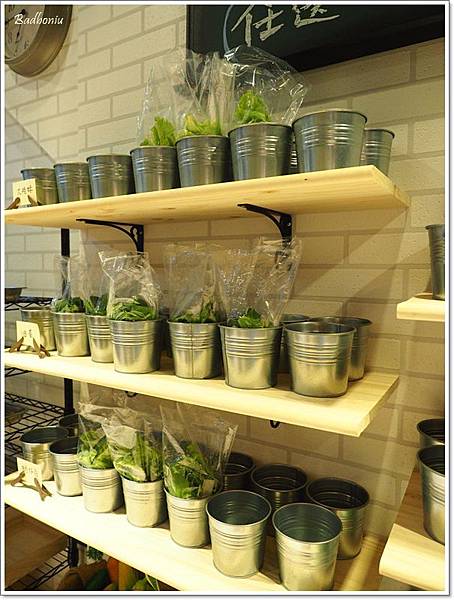 青菜用一個一個的鐵桶裝起來,就像是從盆栽裡現摘出來一樣
