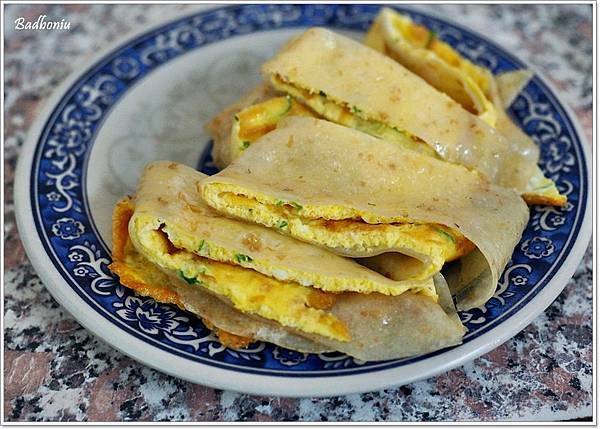 然後就是剛剛在門口看到就很想吃的蛋餅!可以看得出來每一塊餅皮都有厚厚的蛋吧?