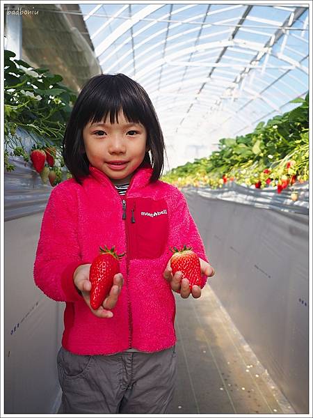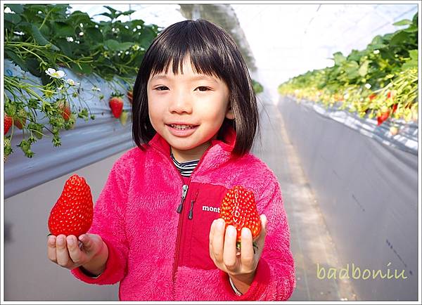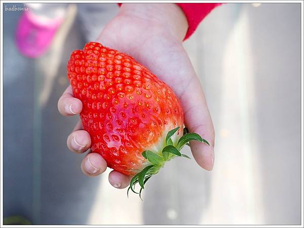 很多草莓個頭都超大,跟壞波妞的手掌一樣大了! 愈紅的就愈甜。我們早點到所以又大又紅的草莓數量還很多。