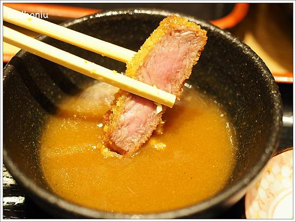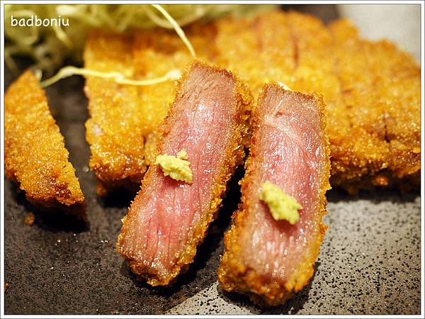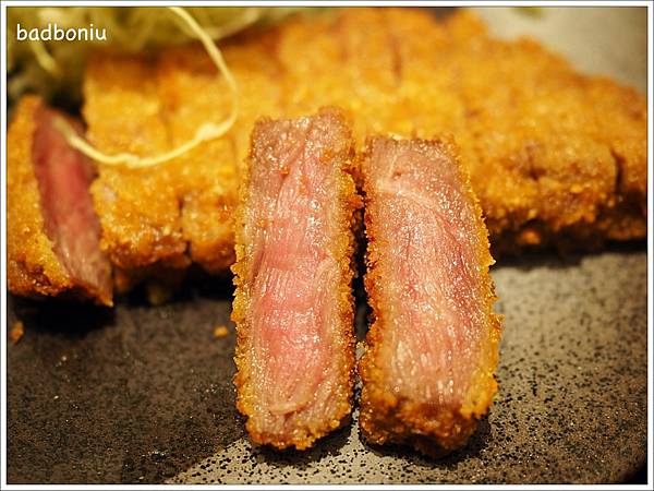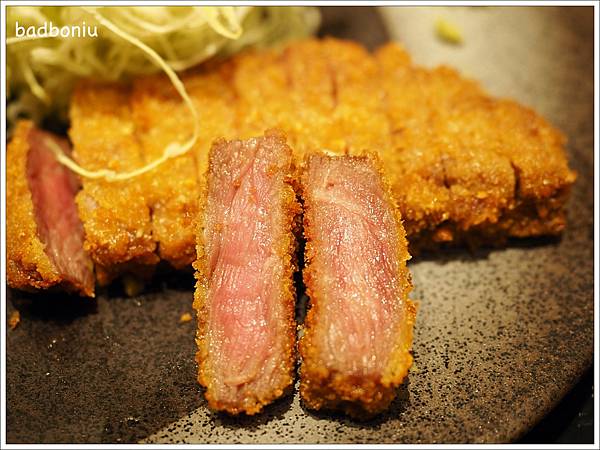 這裡的炸牛排都是嚴選黑毛和牛,高溫炸六十秒就起鍋,所以熟度是最美味的三分熟!從炸牛排切面看起來似乎有點沒熟,但吃起來肉質卻十分柔嫩!