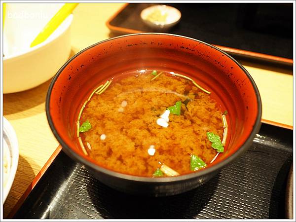 定食還有附味噌湯一碗,看顏色就知道味噌口味比較鹹,但還是不錯喝。