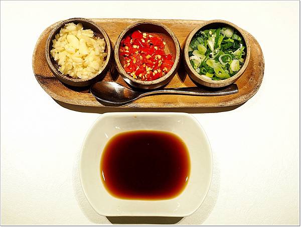 每個人會有一碟特製醬料,隨個人喜好加入蔥蒜與辣椒。這個特製醬汁味道很棒,不會太鹹而且有點甘甜的味道,
