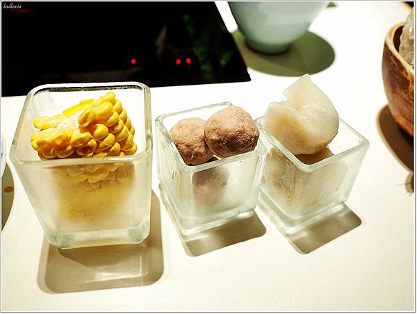 我們點了玉米、貢丸跟水晶餃 ,玉米有一皿已經下鍋來不及拍,所以一共有四皿喔