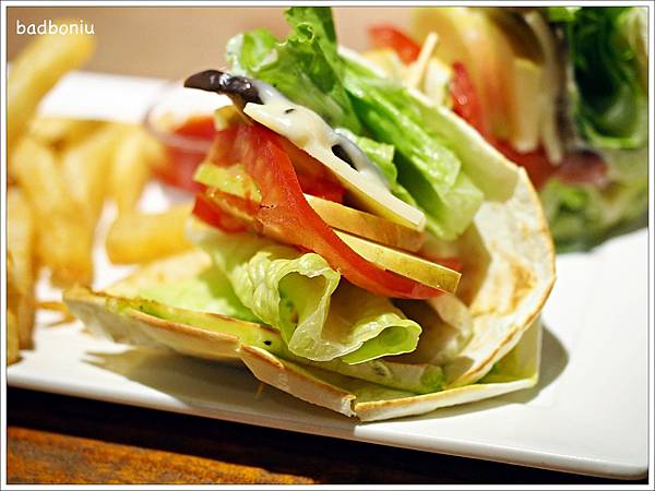 捲餅裡面有許多了蔬菜加上美奶滋,加上有麵粉香氣的墨西哥捲餅,還不錯吃。