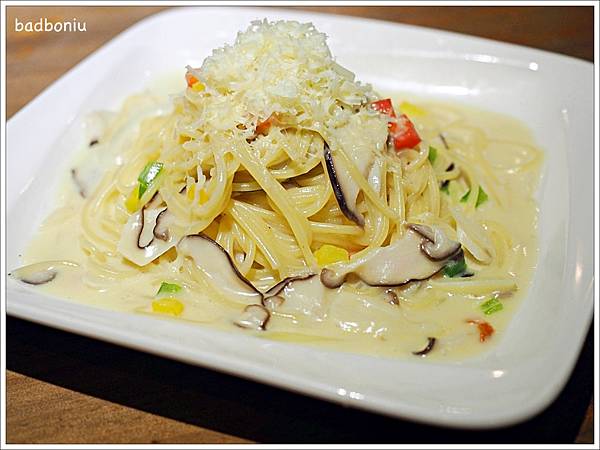 再來這一道是「綜合野菇義大利麵」($220),奶香還蠻濃郁卻不會膩口,加上青菜及野菇,還蠻清爽的。
