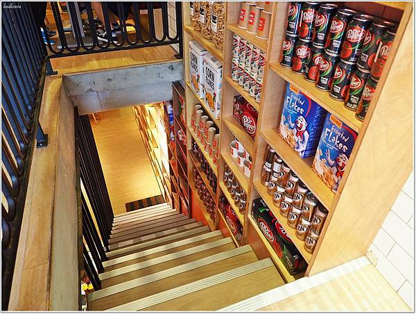 地下一樓還有一些座位! 而且在樓梯旁,巨型櫃子擺滿了瓶瓶罐罐很壯觀,一眼就看到我們家很愛的A&W