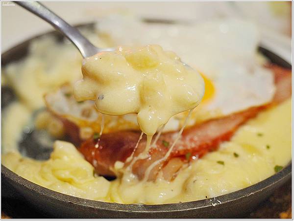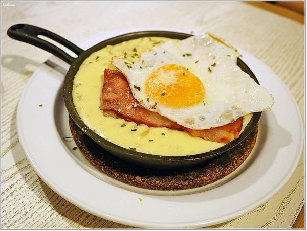 「培根蛋鐵鍋乳酪通心麵」 $220,簡簡單單一個蛋一片火腿,再搭個飲料就是一份感覺很好的早午餐