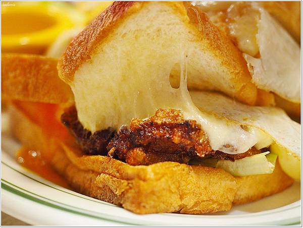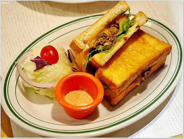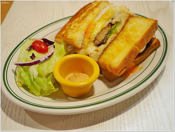 「炸排骨乳酪三明治」$200,三明治都附有生菜沙拉,店內的乳酪有二種,這種是大家印象中會牽絲的那種