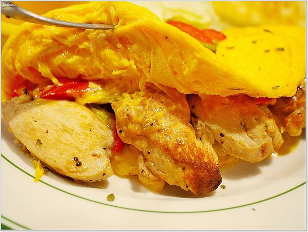 掀開蛋皮裡面是大塊大塊的雞肉,蛋是半熟,蛋汁流入雞肉內,覺得這樣子的肉更加軟嫰了!