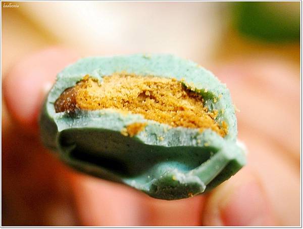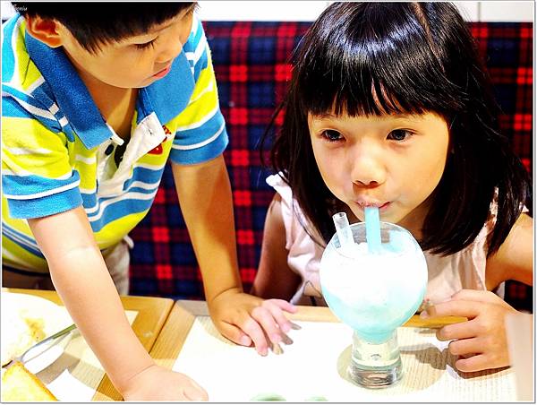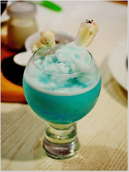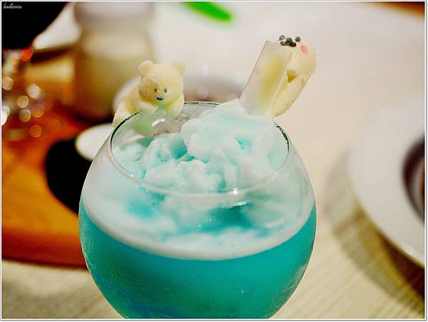 底下的冰沙很有夏日風情的「藍甘菊可爾必思冰沙+寒天晶球 」,透明的寒天晶球帶來了一點點珍珠的感覺,喜愛甜食冰品的人,除了救救北極熊外,也救救自己的肥肉。