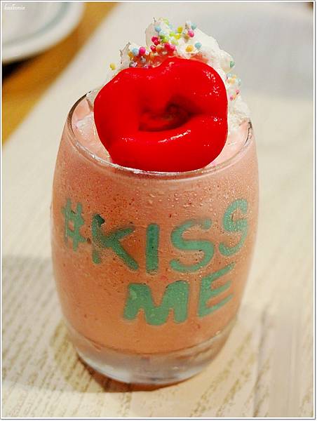 「Kiss Me」$220,略帶點酒精的飲品,是「Vodka伏特加紅唇棉花糖+貝禮詩奶酒+咖啡酒+奶昔冰沙」,上面用棉花糖做的紅唇真的好貼切,情人的嘴就是如棉花糖般的柔軟,讓人意亂情迷,炎炎夏日來一杯,微薰般的迷,又是透沁涼的舒服。