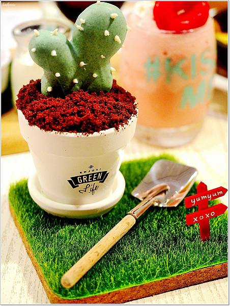 「仙人掌提拉米蘇」$150,底下是另帶點咖啡酒味的YumYum提拉米蘇,上面是仙人掌咖啡巧克力餅乾,餐具也很特別是個小土鏟,配合綠色草皮的托盤,YumYum在餐點的設計上真的別出心裁而且用心