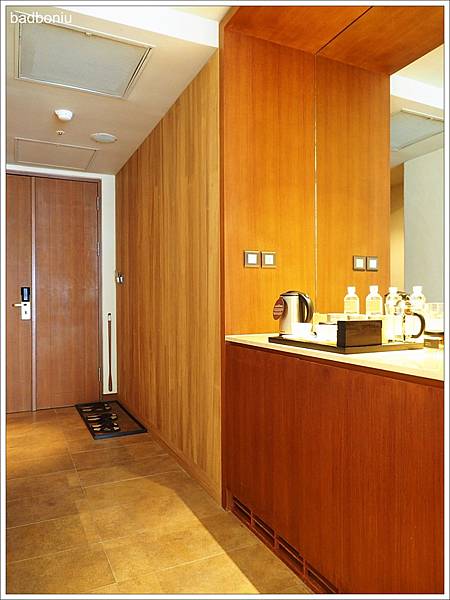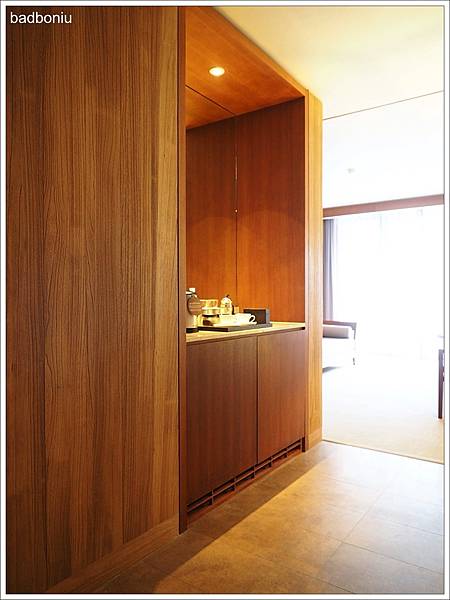 玄關的旁邊就是茶水及mini bar,櫃子使用的木頭感覺好有質感。