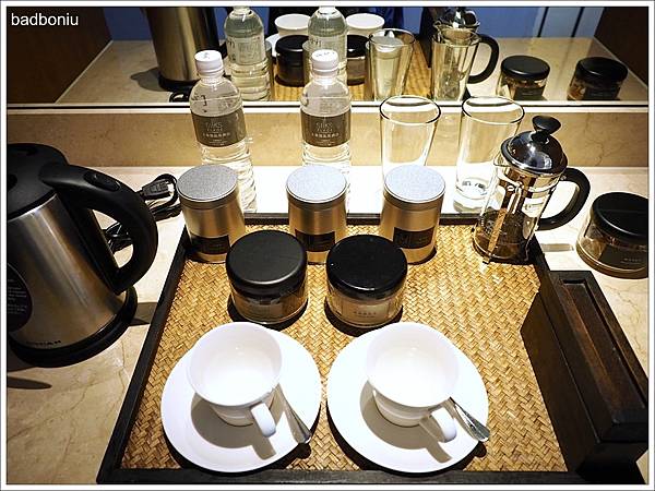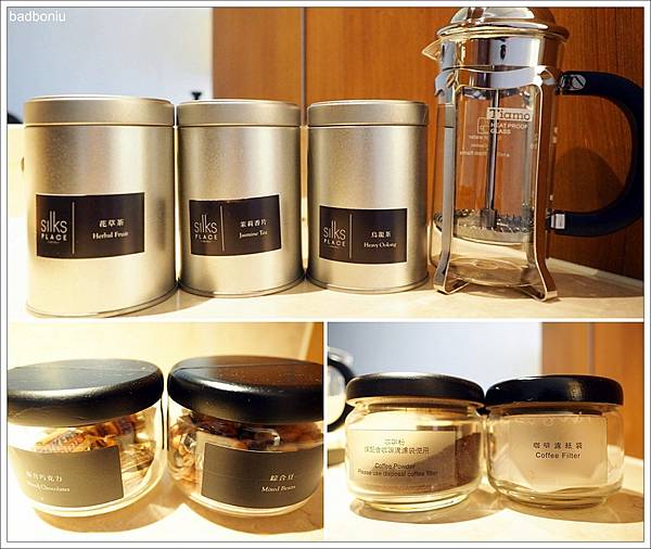 這裡的茶可不是使用一般飯店常見的茶包,鐵罐裡裝的都是貨真價實的茶葉,還附有沖茶器可以喝出茶葉的香氣。除了茶葉,還有咖啡粉及咖啡濾紙,此時沖一杯自己專屬的手沖咖啡,感覺就好文青啊!罐子裡還有巧克力及堅果,嘴饞或嗑牙時可以派上用場。