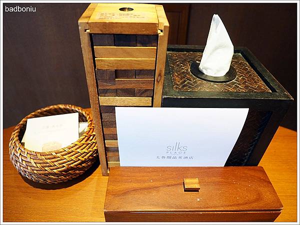 桌子上的木籃內是迎賓小點心:據說是全花蓮最好吃的吳府其馬鋪的沙其瑪。一旁還有很具歷史質感的疊疊樂,在房間內就能親子同樂玩桌遊。木盒內裝的是電視搖控器。