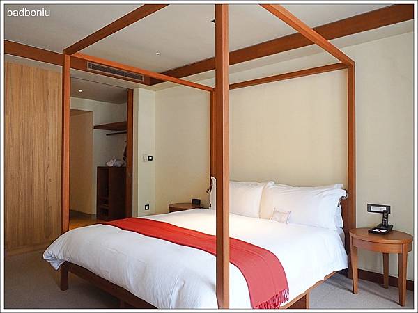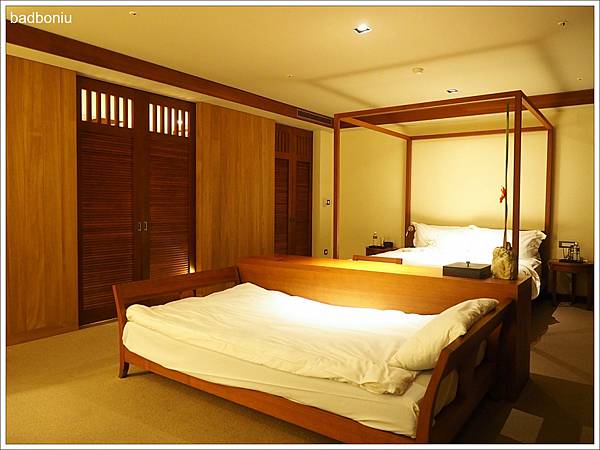 不僅傢俱,裝潢上也使用了大量的柚木質材,讓整個房間既中式、卻也帶有南洋島嶼的渡假風。