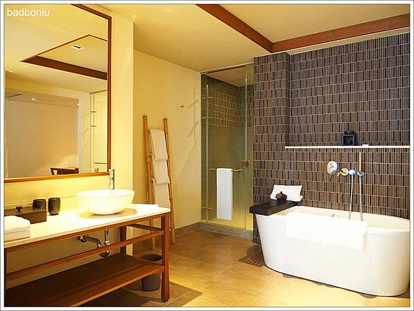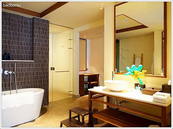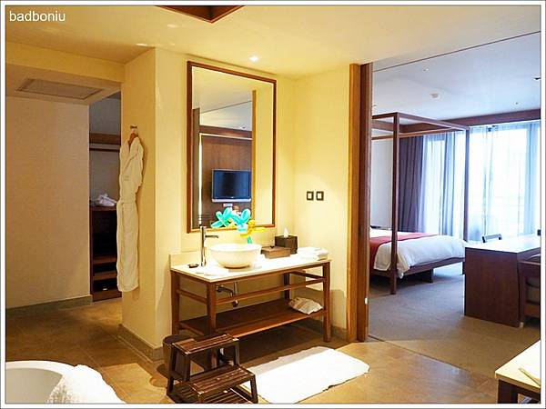 淋浴間外有著峇里島風的竹製毛巾架,以及浴袍也掛在牆上。