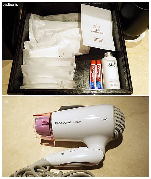 吹風機是好用的PANASONIC,盥洗備品提供很多樣,也有提供身體乳,而且若是加上另一個洗手檯上的備品,居然有四人份呢!