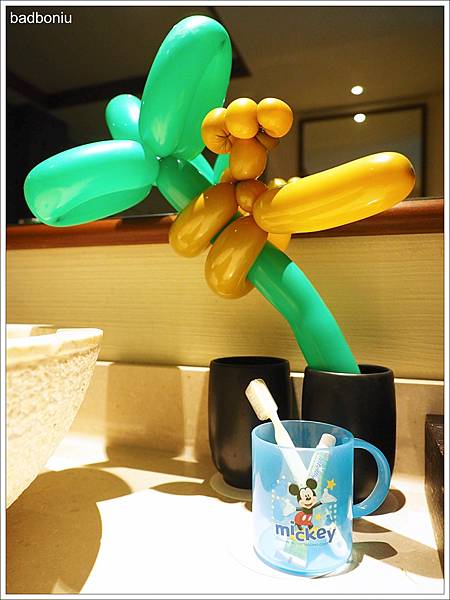 除了大人的備品,飯店還有提供小朋友的牙膏牙刷,還有好可愛的迪士尼漱口杯及造型氣球,這些都是可以帶回家的。