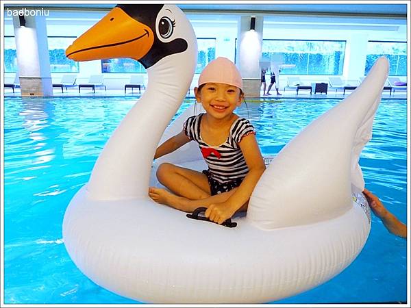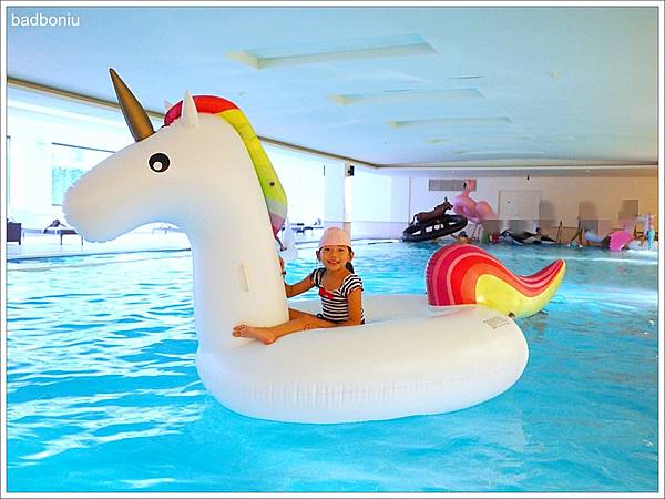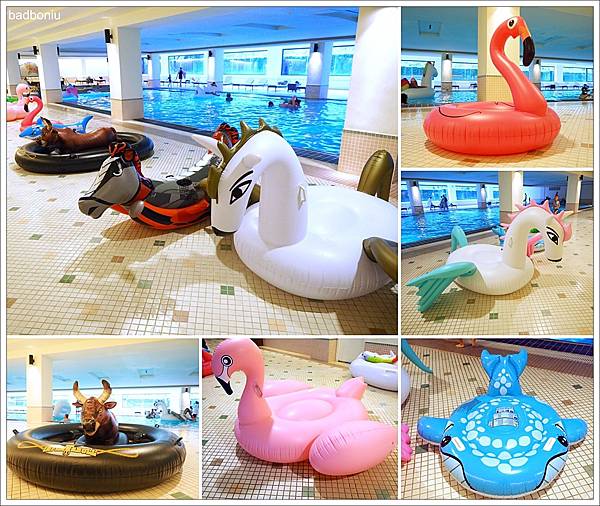 頂樓泳池15:00-15:30所舉辦的「泡泡同樂會」因為午後雷陣雨而取消,雖然好可惜,但我們趕快回房換泳衣,趕上16:30-18:00、在B1的室內泳池所舉辦的「水上動物園」活動!