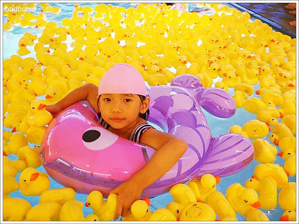 另一邊的兒童池還有滿池子的小鴨跟小朋友一起泡水,小朋友看到這麼多小鴨都超開心的!(不過波妞因為她明明踩得到地卻被波妞媽要求要帶泳圈,所以不是很開心XD)