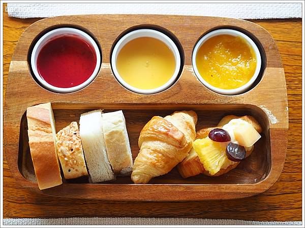 拍完照、活動完肚子也餓了,早餐除了可以去一樓衛斯理西餐廳用buffet外,交誼廳也有供應套餐式的早餐,首先上桌的是很多種類的麵包盤,附芒果鳳梨、蜂蜜及草莓果醬。
