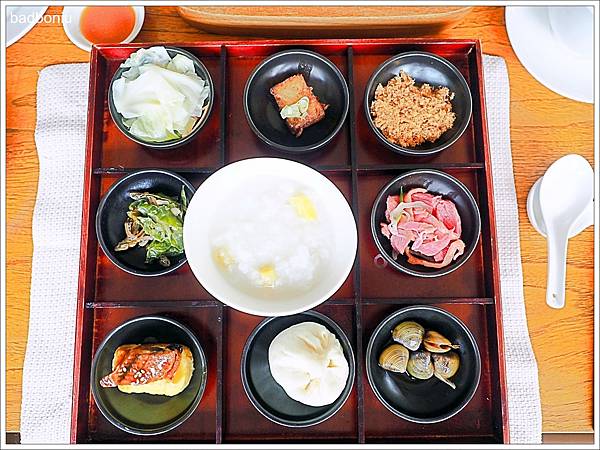 早餐有中式及西式兩種;這是中式的九宮格早餐,有地瓜粥、配菜,還有附公正包子!