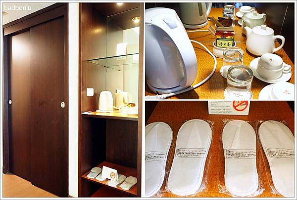 玄關的入口是茶水mini bar及衣櫃,有附茶包、咖啡包還有拋棄式的室內拖鞋。