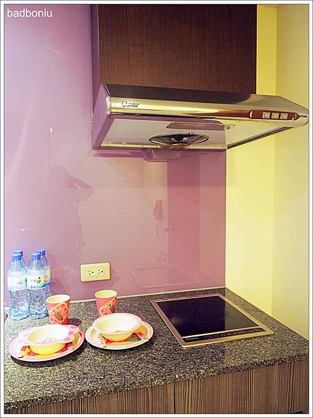 小廚房有附電磁爐,還有抽油煙機,所以若是不想外食、想自己煮比較健康的話,有這個小廚房就真的很方便。