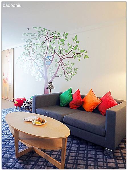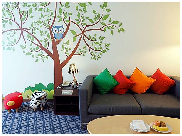 沙發旁的動物造型椅、客廳牆上的童趣風樹木壁貼、以及沙發上色調明亮的抱枕,都讓人覺得很溫馨,沒有一般商務飯店冷冰冰的感覺。