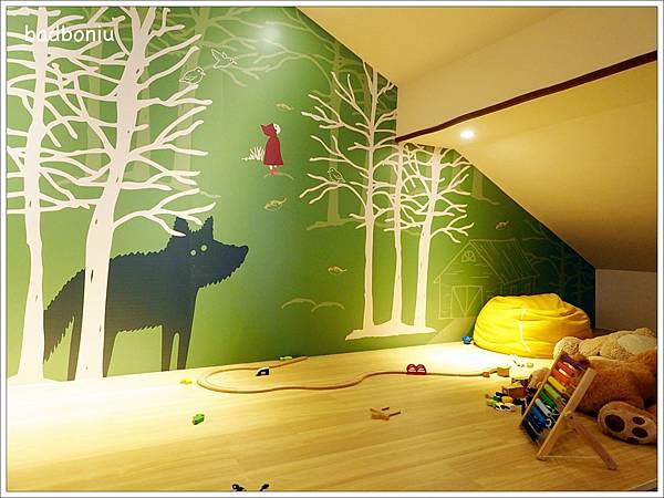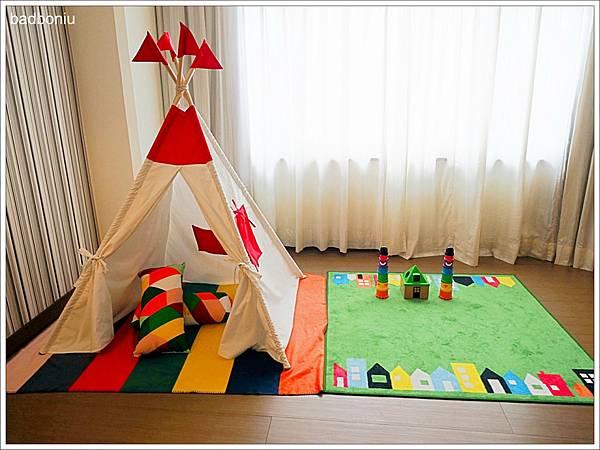 親子客房內還幫小朋友們擺放了木帳蓬及遊戲地毯、積木玩具,讓小朋友有專屬於自己的遊戲空間,可以安靜一會不來吵爸媽XD