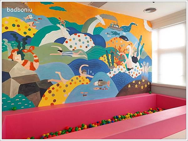 插畫牆下是繽紛的大球池,小朋友可以在球池裡翻滾真的是無敵開心的!