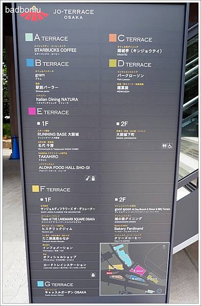 「JO-TERRACE OSAKA」分成A~G terrace,目前進駐的店家就如指示牌上所寫的這幾間。