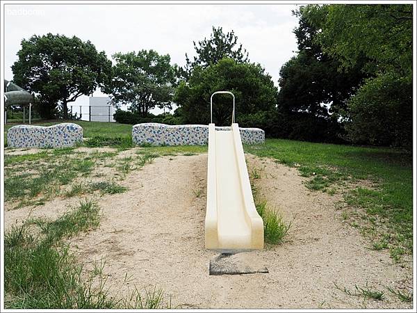 滾輪不滑沒關係,旁邊還有造型奇特、顏色鮮豔的磨石子溜滑梯!