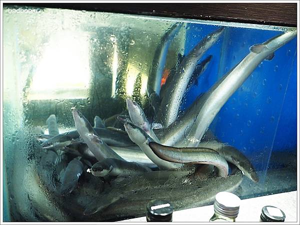 店裡還有一個養鰻魚的水族箱,裡面的鰻魚都股溜得很。不過看水箱外都是露珠,顯然水箱的水溫蠻低的,也許是為了降低鰻魚的活動力吧!