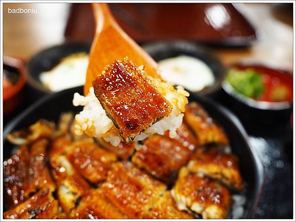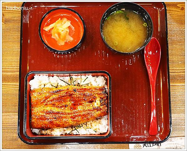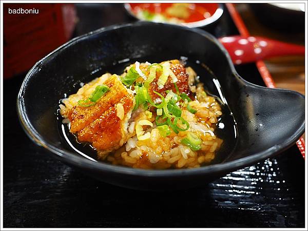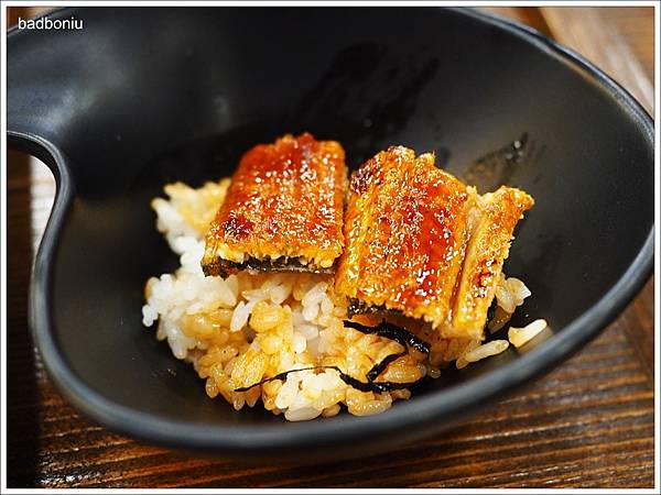 蒲燒鰻魚是先蒸過再烤,表面烤過後油亮油亮的很入味。上桌時店員有提醒注意細刺,但其實吃起來刺不會太多。底下的飯醬汁稍微有點少。