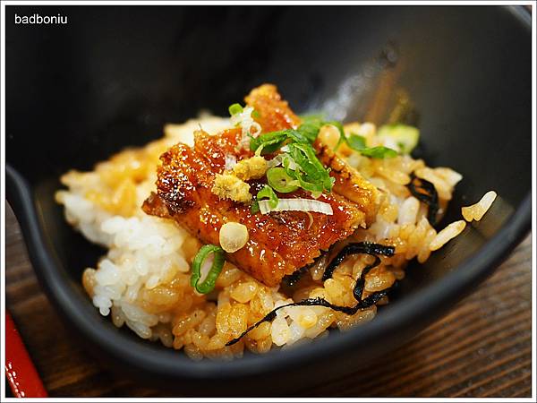 鰻魚桶飯的鰻魚烤過之後有再切小塊,感覺烤得比剛剛的鰻魚重的鰻魚酥脆,吃起來表面「赤赤」的,好好吃。