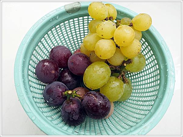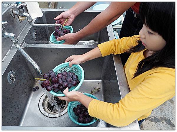 將採好的葡萄去掉袋子後,用小籃子盛裝後再拿去洗手檯洗一洗。